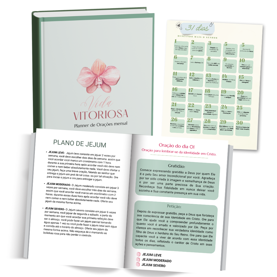 O Vida Vitoriosa é um kit espiritual completo para mulheres que desejam viver um ano alinhado com Deus, cuidando da fé, da mente, dos sonhos e da rotina.